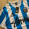 The 1986 Argentina X Stussy Retro Kit is a tribute to one of the most iconic football teams in history, blending vintage sportswear with contemporary street style. This limited-edition jersey pays homage to the legendary Argentina team that triumphed in the 1986 FIFA World Cup, led by the incomparable Diego Maradona. The design mirrors the classic Argentina kit from that era, featuring the unmistakable sky blue and white stripes, with a modern twist courtesy of Stussy’s renowned streetwear influence.
