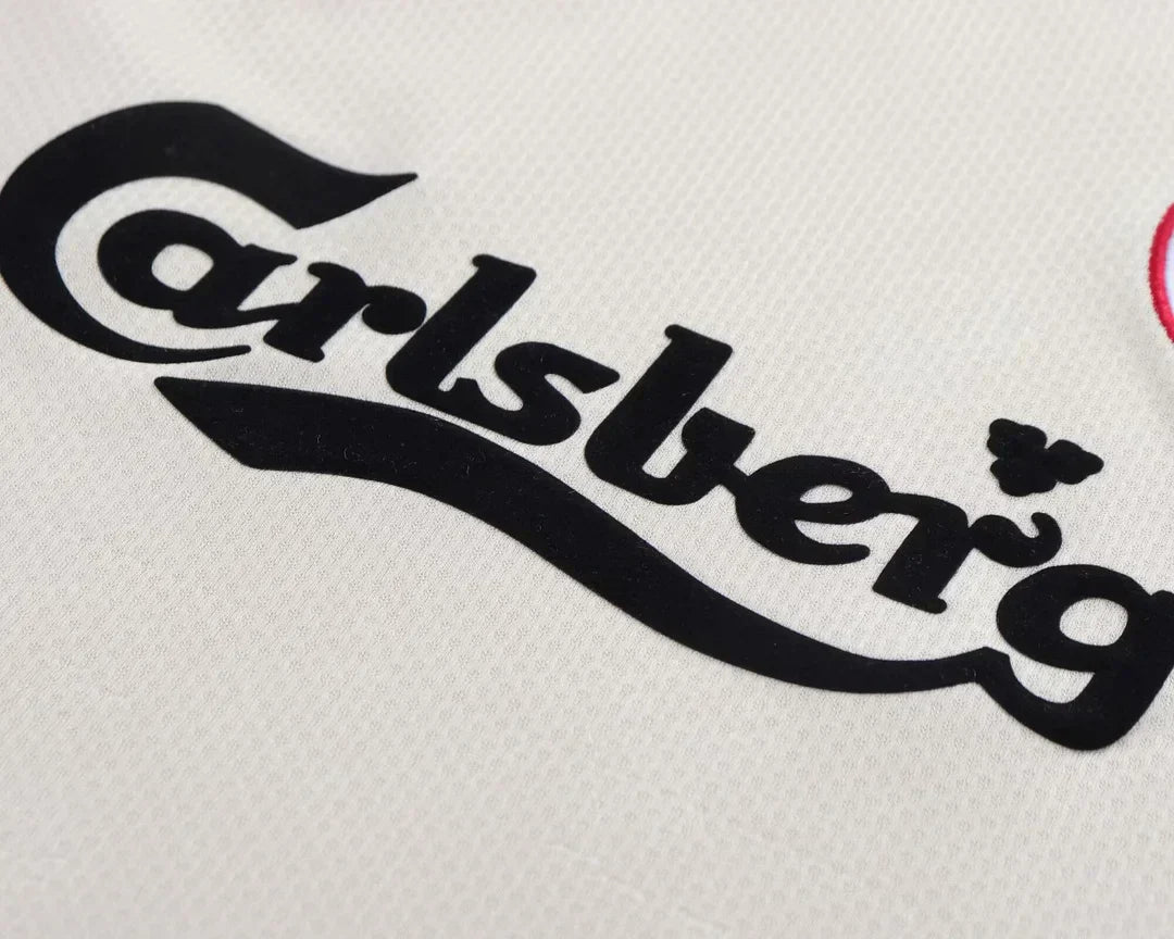 The Liverpool 1996-97 away kit is famous for its elegant cream color with black and red detailing, paired with the legendary Carlsberg sponsor. This jersey became iconic during an era when Liverpool was competing at the top of the Premier League, with Fowler (#9) scoring goals for fun, McManaman (#7) dazzling with his dribbling, Redknapp (#11) controlling the midfield, and Collymore (#8) adding firepower in attack.